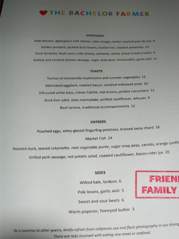 So, my youngest sister was in town last week so we took her to The Bachelor Farmer. First thing I noticed was the faint smell of manure and hay as soon as we walked in. My sisters didn't seem to notice or chose not to notice. I wonder if it's to make the place seem more "authentic" as if you're actually on a farm. The decor was simple and rustic. Though the place did remind me of ABC Kitchen in the Flatiron District when I was in NY back in April. Only major differences, ABC's decor was more "barn-chic", the ambiance was more warmer and modernly rustic (the tables and chairs were made from reclaimed materials), more trendy, much better looking people, most likely be dinning next to a celebrity, and food taste better. Both places have the popular and so-called farm-to-table concept, contrastingly ABC Kitchen serves New American and The Bachelor Farmer serves Scandinavian food.